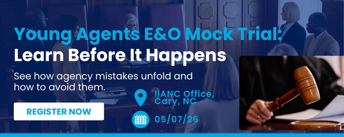 Join iLEAD on May 7th at the IIANC office in Cary for an interactive Mock Trial that brings real-world E&O scenarios to life. Using a commercial property fire loss case, you’ll see how common agency mistakes play out in a courtroom setting and what you can do to prevent them. Led by Annette Ardler of SwissRe, this session delivers practical insights you can immediately apply to better protect your clients and your agency.